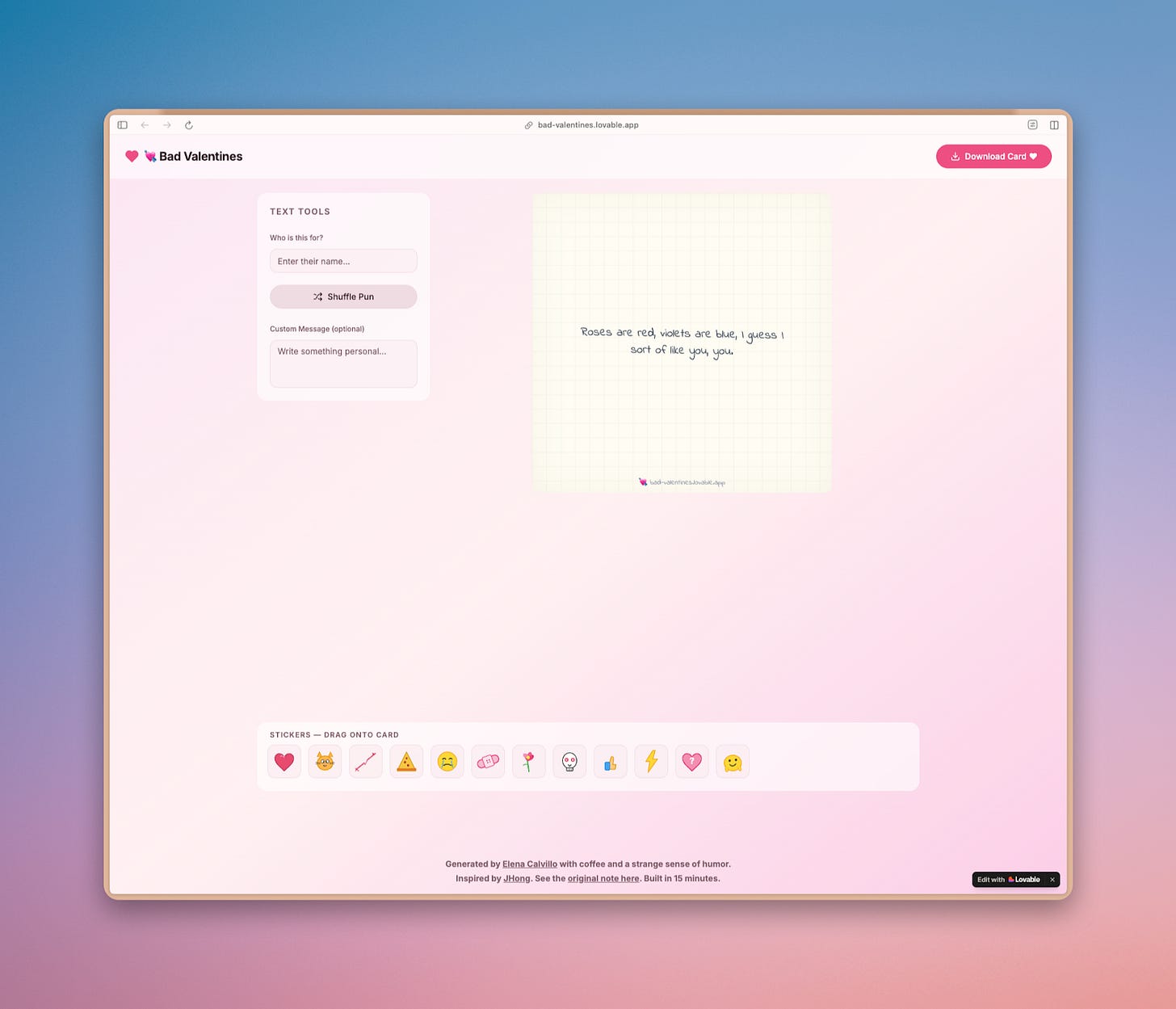 Recently, I decided to test this by building something chaotic and fun. I launched bad-valentines.lovable.app. It is a sticker app for people who hate traditional romance. It has messy stickers and terrible puns. It isn’t “perfect” by corporate standards, but it is live and it works.