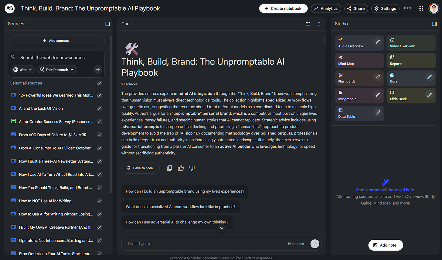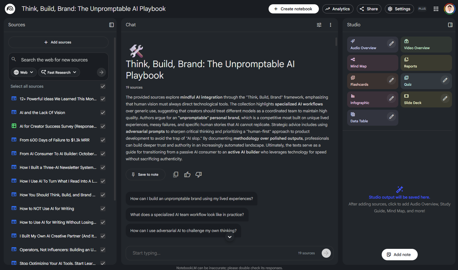 This is what I’m doing right now. I’m using Notebook LM to gather all the data I have about thinking, building, and branding with AI. That means: 19 collaborative articles, one 15+ creator survey, random interviews here and there.